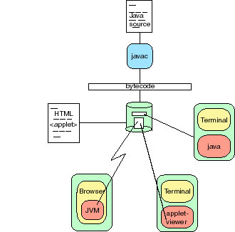 mainmethod. If the Application needs a window in which to display output, it should be declared as a subclass of Frame (extends Frame).In order for an Applet to be run, it must be referenced through an Applet tag included in an HTML document. The Applet is then run by referring to the HTML document either by a Java-enabled browser (e.g., Netscape) or by the appletviewer included as part of the JDK.
